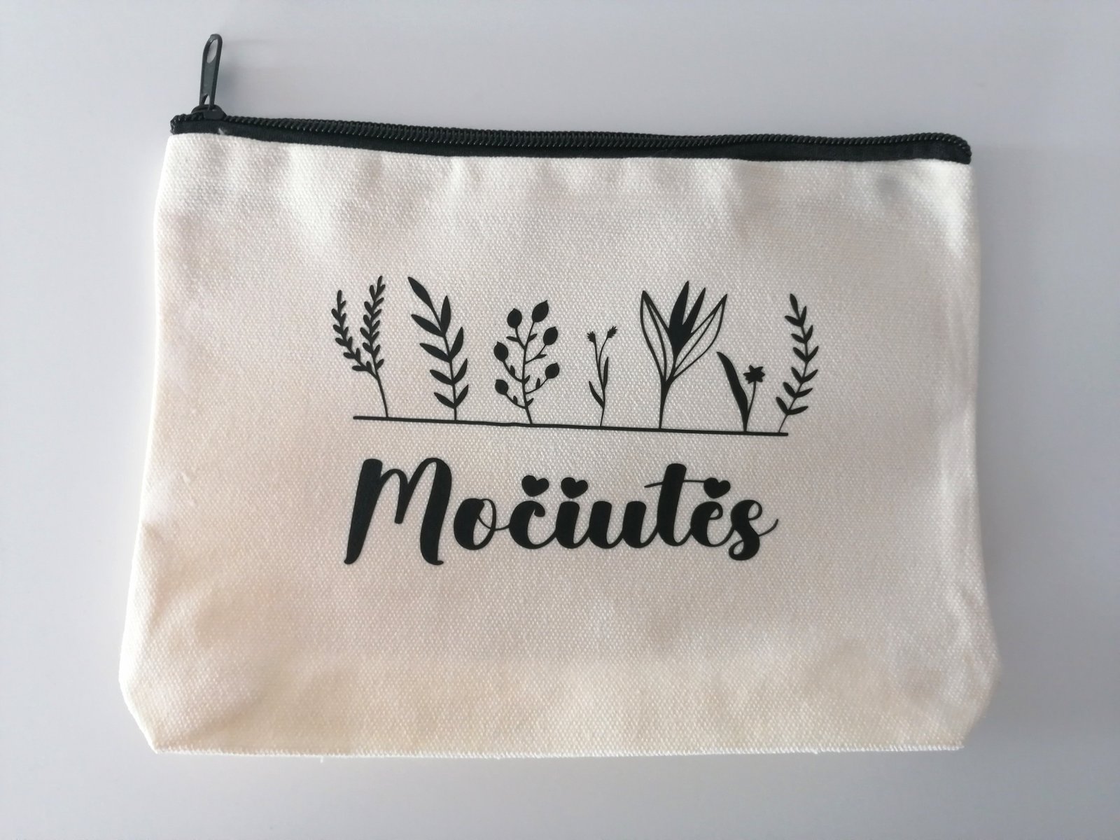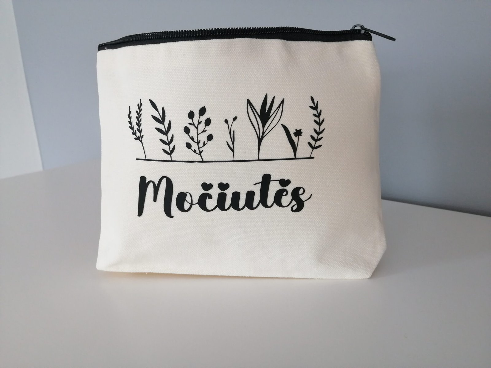 Drobinė kosmetinė su užrašu.